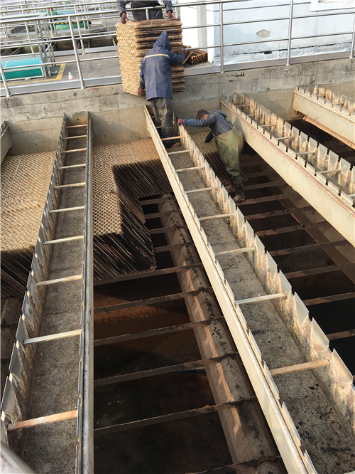 据相识,临江污水厂5组澄清池自建厂投运以来,由于使用情形特殊,部分斜管已泛起脆裂、松动、脱落扭曲等征象,增添了澄清池刮泥机肩负,有时甚至还会导致刮泥板卡死,严重影响出水水质。为此,该厂决议于春节前水量较小之际对澄清池斜管举行升级刷新,选用乙丙共聚海浪形片材斜管,该斜管与原聚丙烯六角形蜂窝斜管相比,韧性更强,具有稳固形、不脆裂、使用寿命长的优点。