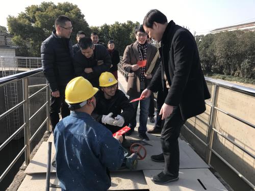 在钱江厂,慰问组实地旅行了一期生化池磨练事情,走访了各生产车间,详细询问了在岗职工的事情情形和身体状态,谢谢各人这一年来为排水事业做出的支持与孝顺,并亲手送上新年红包,希望各人在新的一年里再接再厉,再创绚烂。